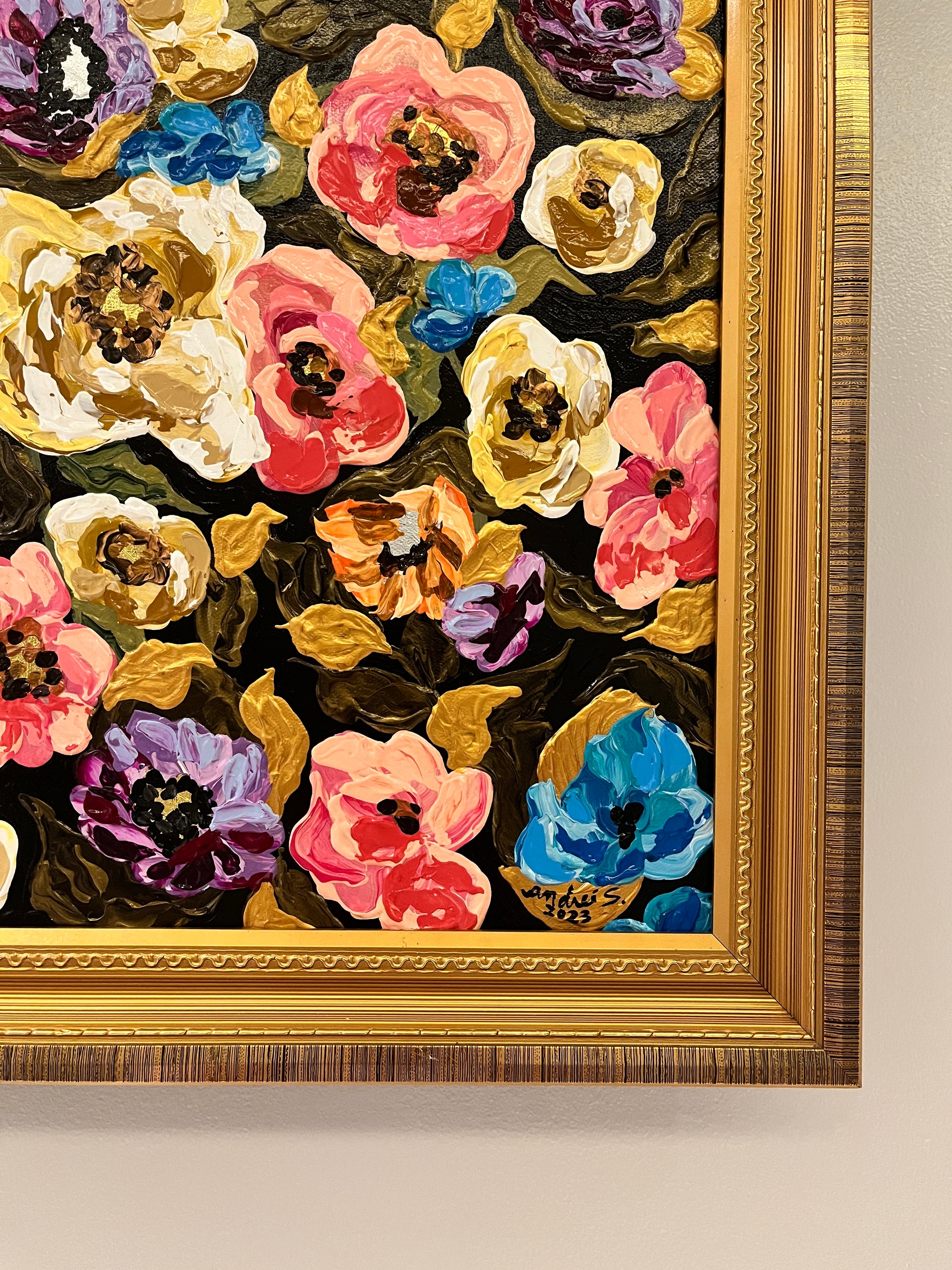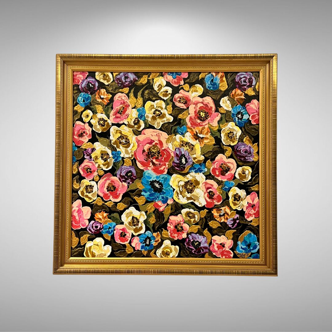 Mixed Media (acrylics & gold leaf) | 24 x 24 ” box-type canvas | Approx. 28 x 28 ” total with frame | 2023 |