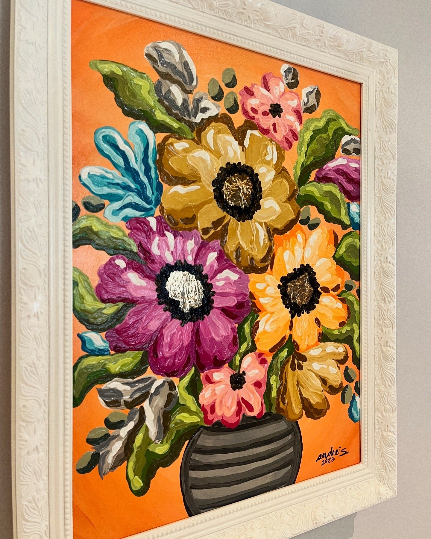 Mixed Media (acrylics & gold leaf) | 18 x 24 ” box-type canvas | Approx. 22 x 28 ” total with frame | 2025 |
