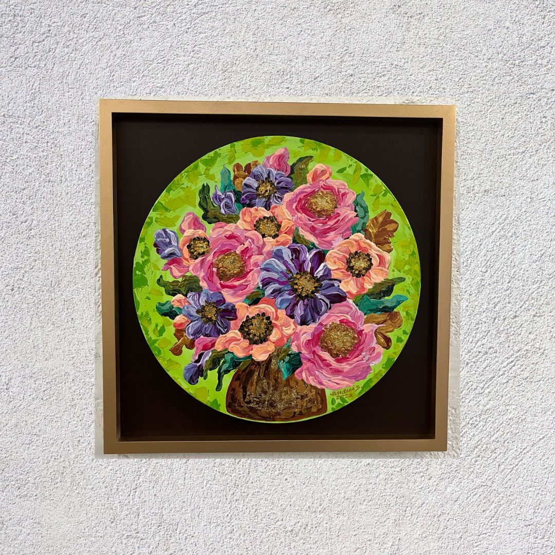 Mixed Media (Acrylics & Gold Leaf) | 12 ” round canvas | 14.75 x 14.75 ” total with frame | 2023