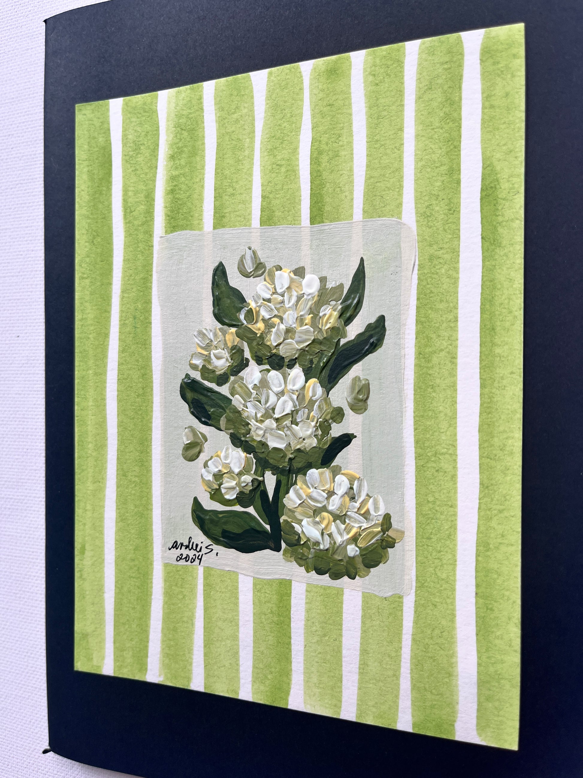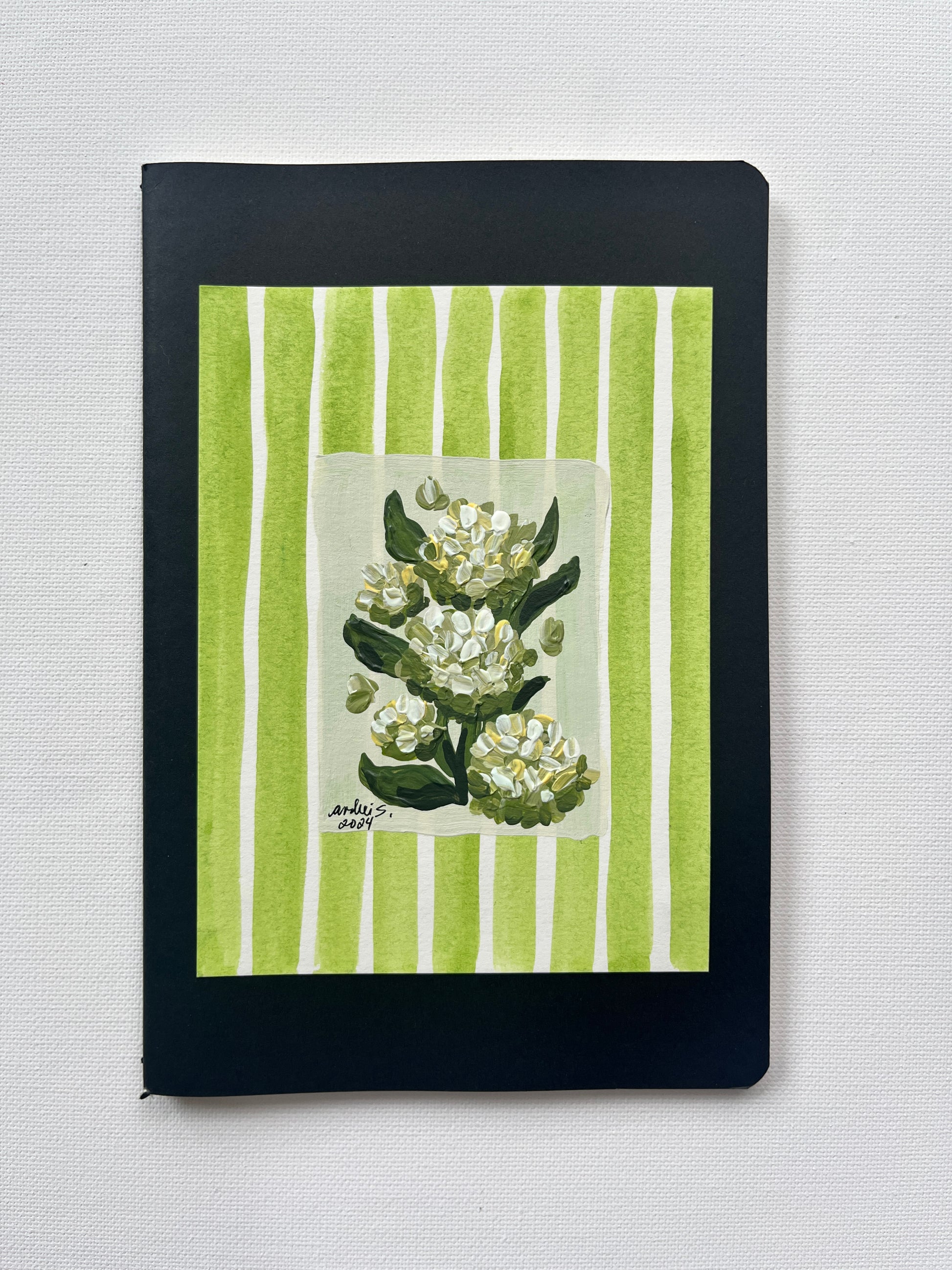 NOTE: Mixed Media (watercolor & acrylics). Thin Journal (approx. 30 leaves); Blank pages (no lines nor dots); Postcard-size painting on a 5.5x8" journal.
