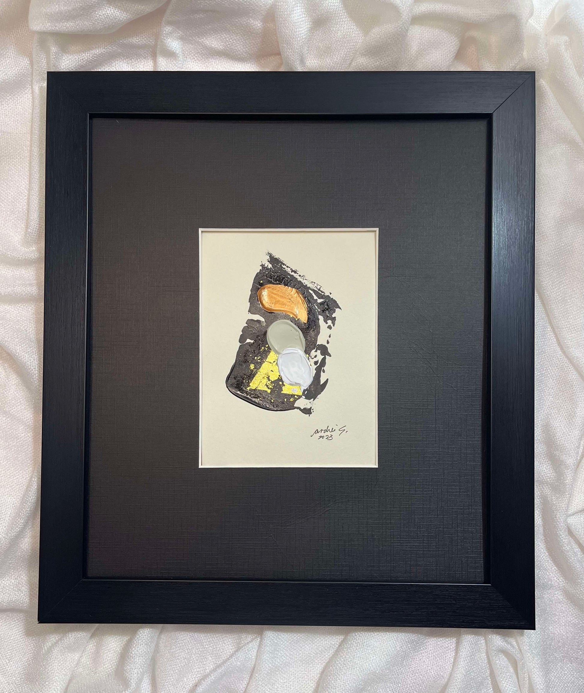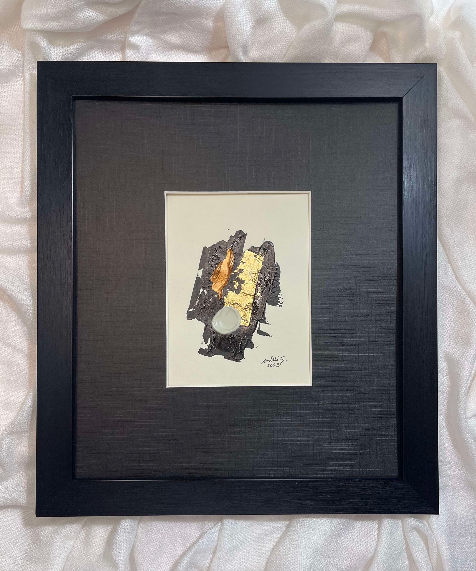 Gold Leaf & Acrylic Painting | With glass, matting & frame | 4 x 5.5” acid-free paper | Approx. 12 x 13.5” approx. total with frame | 2023